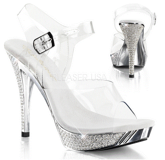 Our top selling shoes for bodybuilding and bikini competitions are these 4.5 inch heel ankle strap sandals with rhinestone covered heels and mini-platforms. The Elegant 408 are beautiful shoes under lights and very easy to walk in, even if you're a novice in high heels.